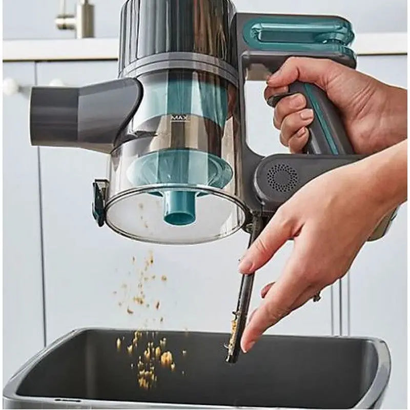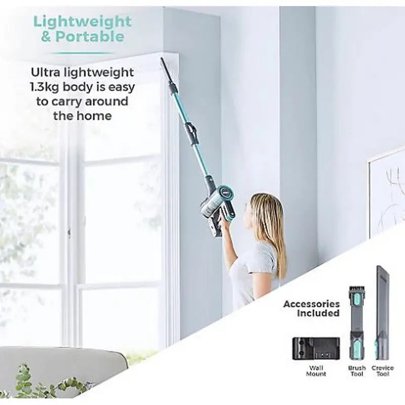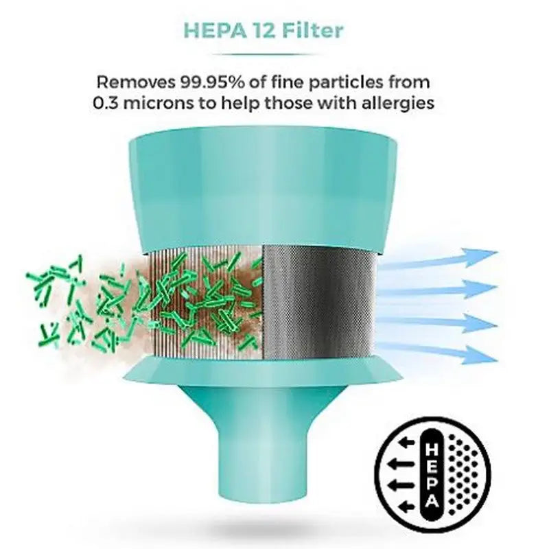 This vacuum features a motorised anti-tangle floor head that effectively agitates dust and dirt while preventing hair from wrapping around the brush bar. Equipped with a HEPA 12 filter, it captures 99.95% of fine particles down to 0.3 microns, making it ideal for allergy sufferers and promoting a healthier home environment.