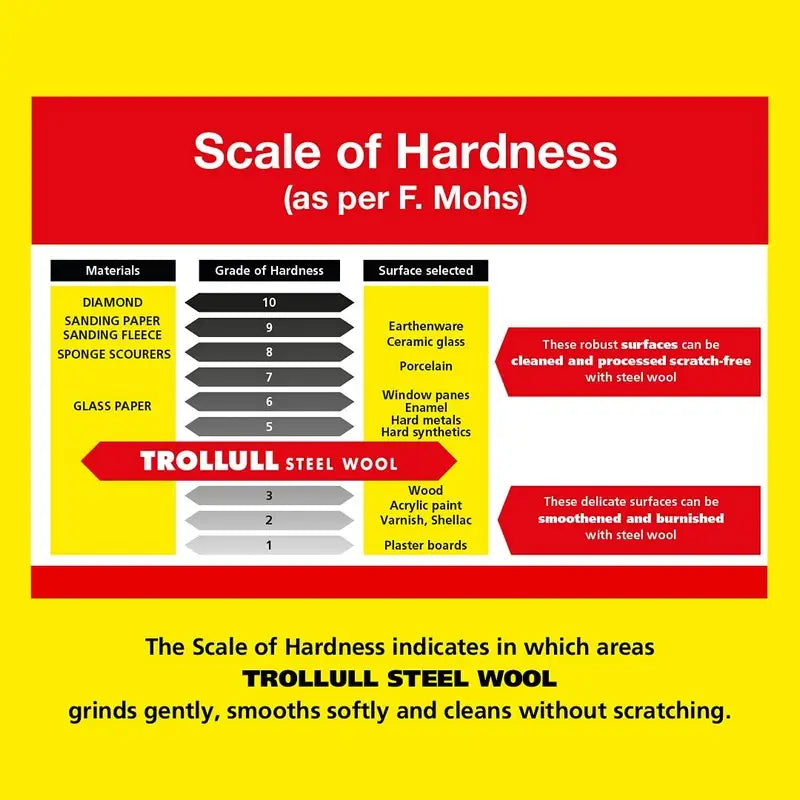 - The universal product for polishing, grinding, and cleaning a wide variety of surfaces, such as wood, metal, glass, or stone. Available in 9 grades from extra fine, 0000, to ultra-coarse, 5. TROLLULL steel wool is flexible and guaranteed scratch-free.
